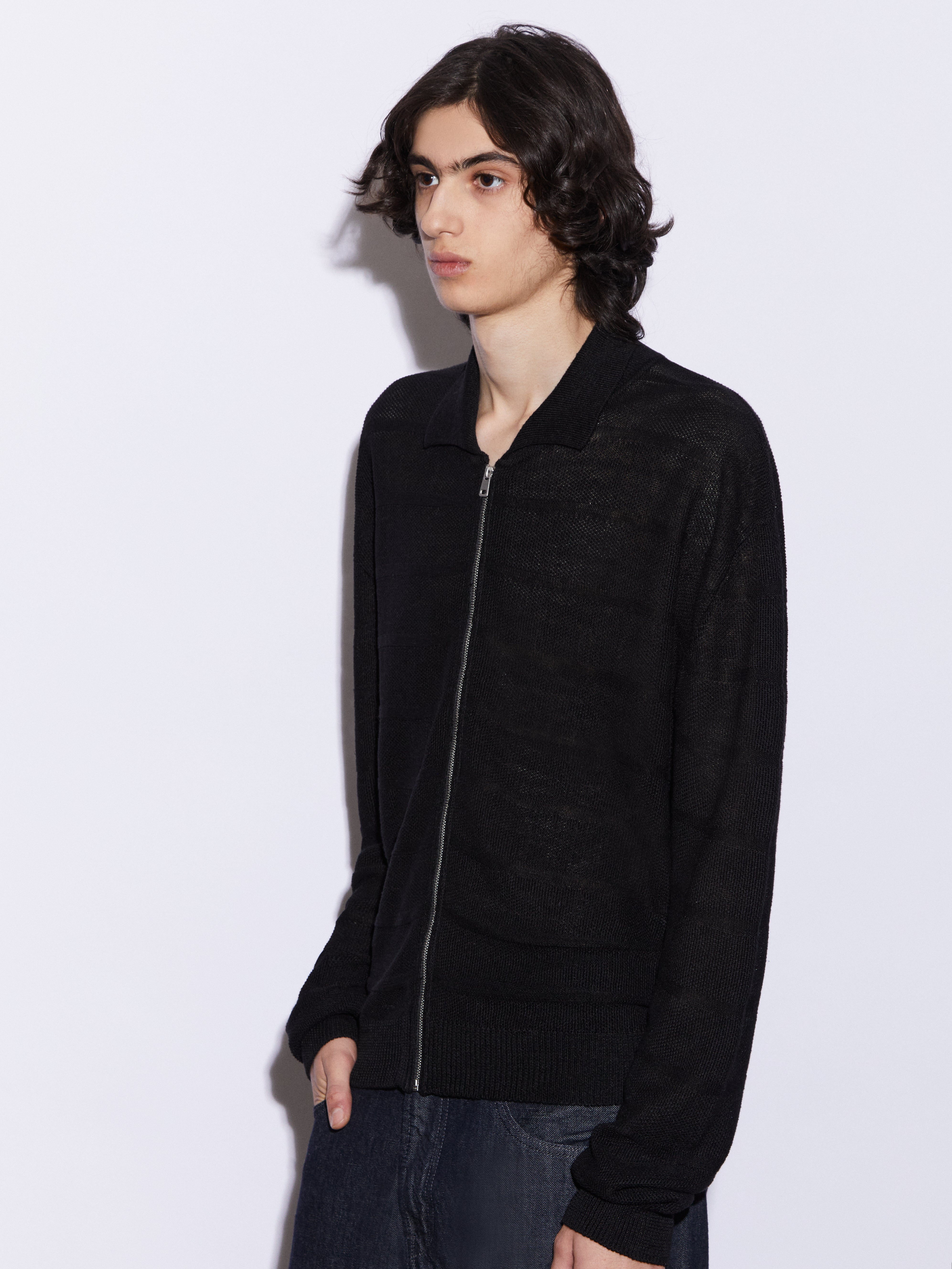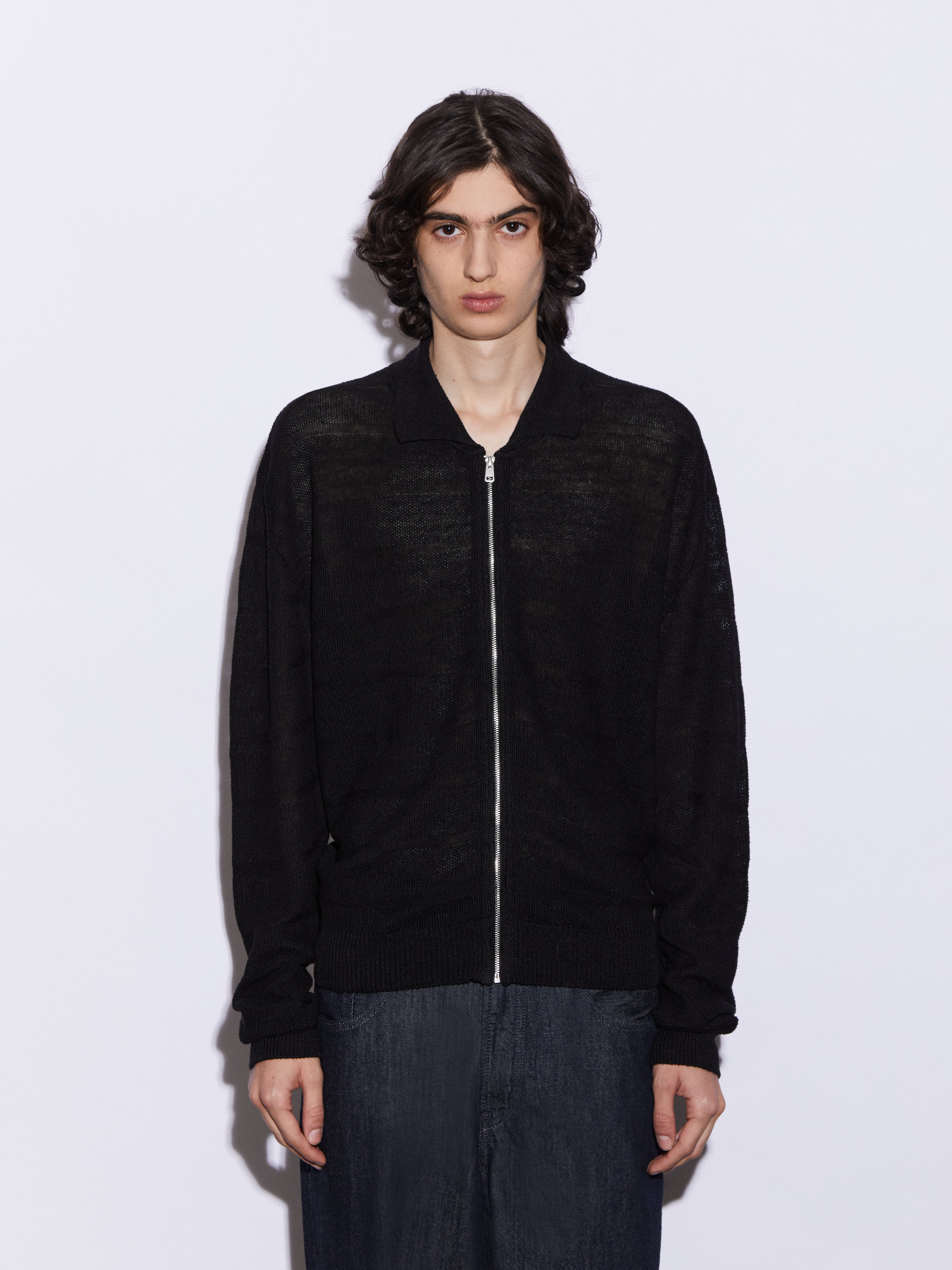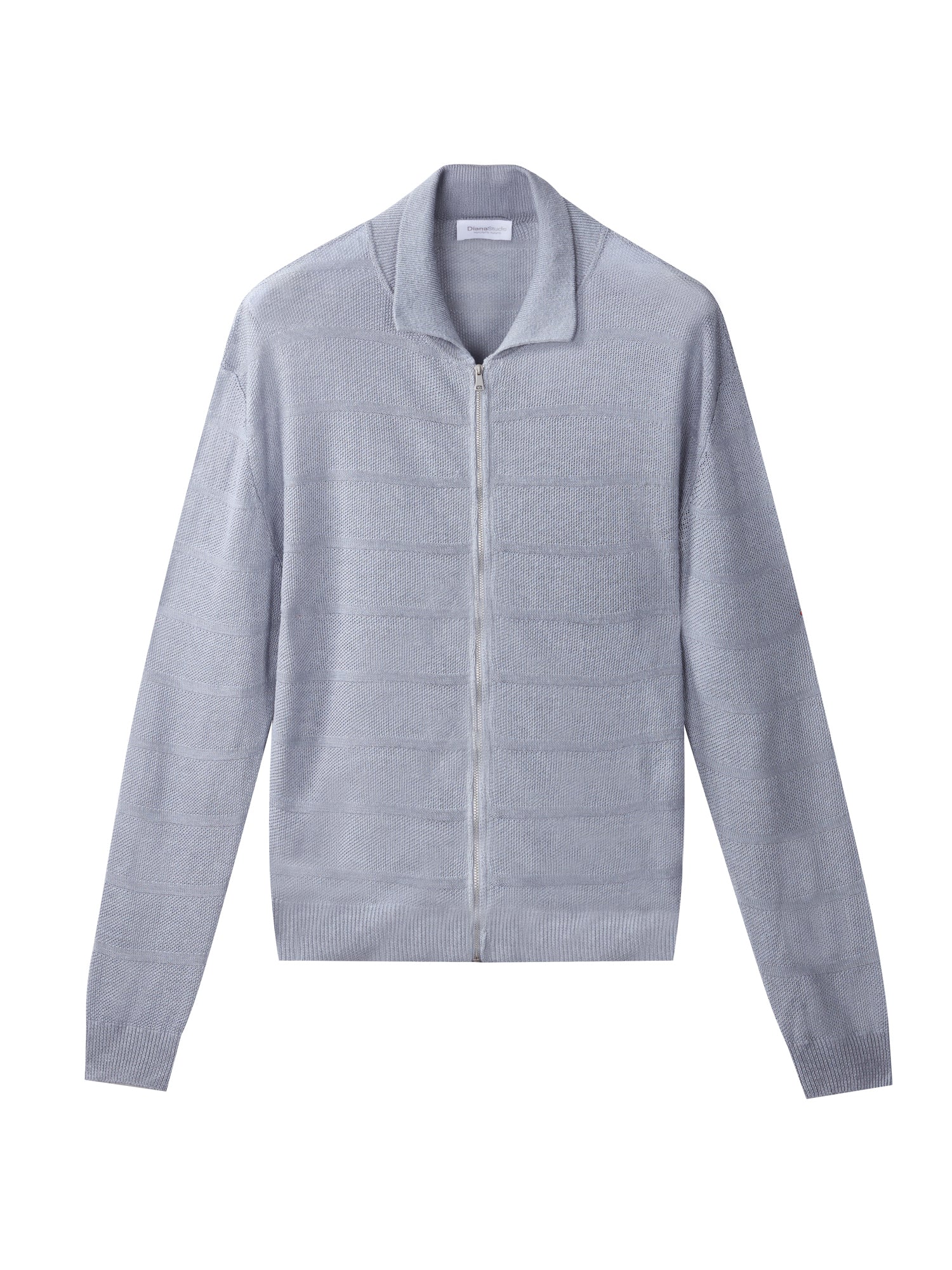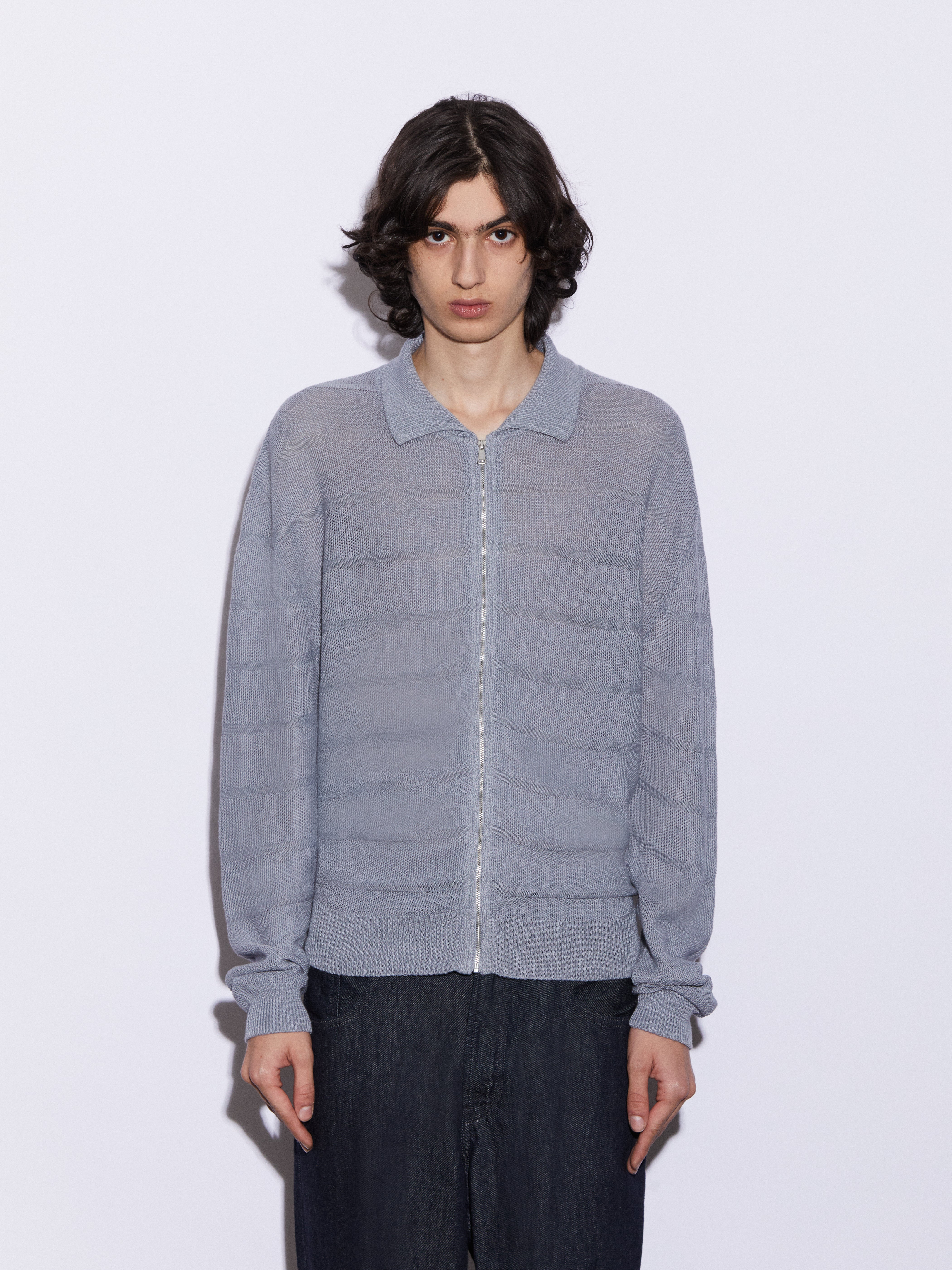 Cardigan full zip con collo a polo realizzato in 100% lino, lavorato in punto chicco di riso rigato. La lavorazione introduce un ritmo visivo pulito e una presenza materica definita, mantenendo una freschezza naturale e una mano fresca e confortevole. La costruzione è leggera ma presente, pensata per un’estetica contemporanea, misurata e pulita.