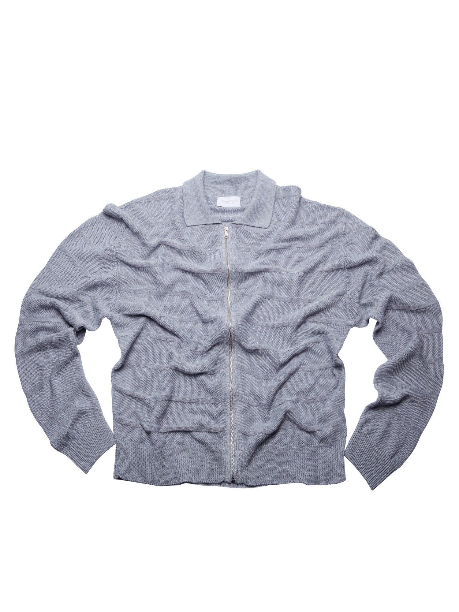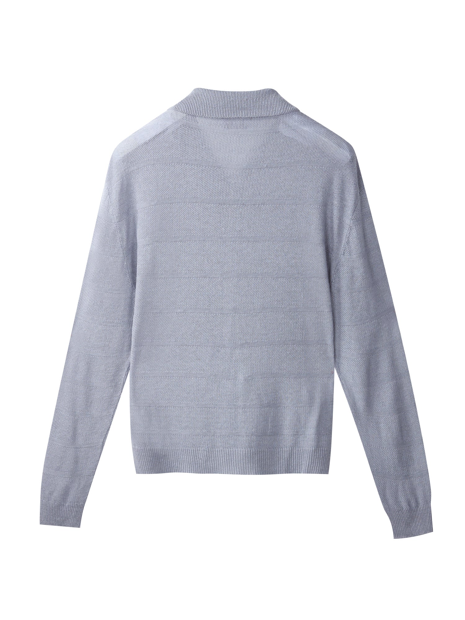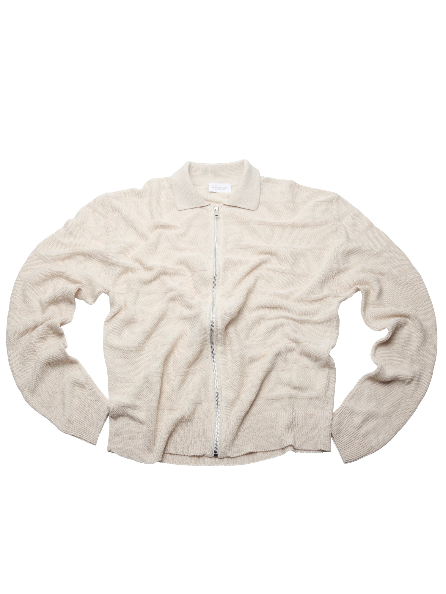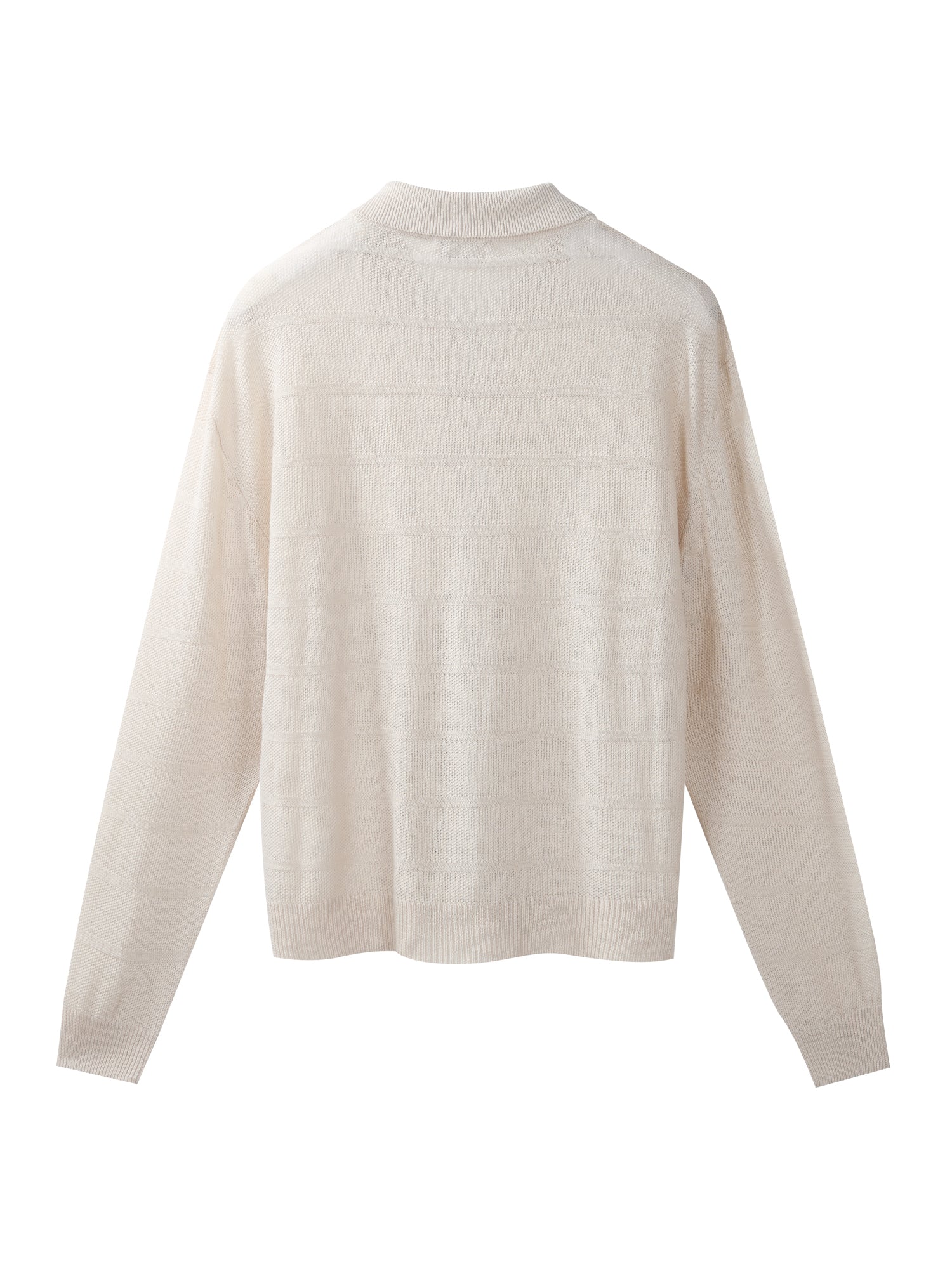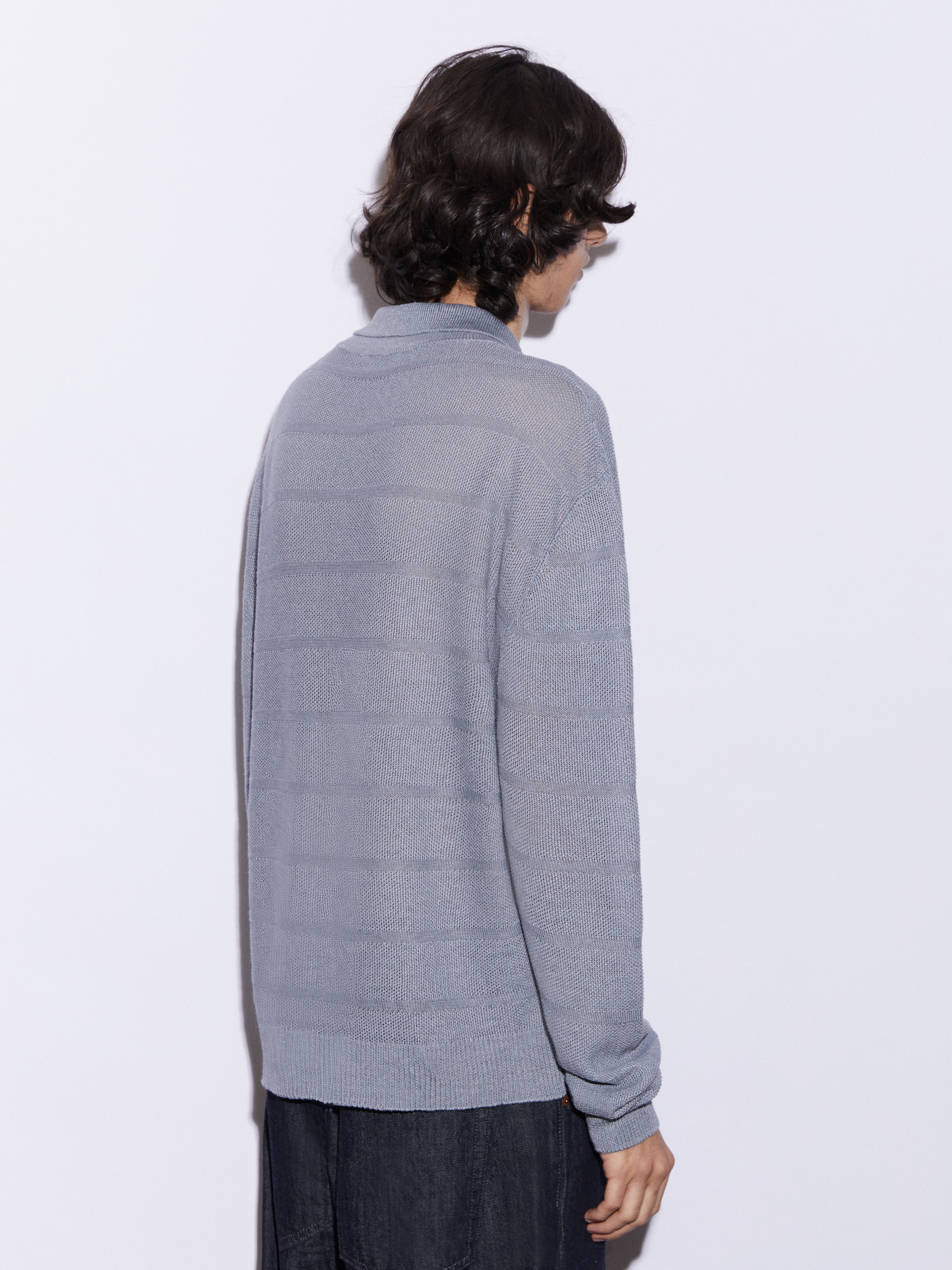 Cardigan full zip con collo a polo realizzato in 100% lino, lavorato in punto chicco di riso rigato. La lavorazione introduce un ritmo visivo pulito e una presenza materica definita, mantenendo una freschezza naturale e una mano fresca e confortevole. La costruzione è leggera ma presente, pensata per un’estetica contemporanea, misurata e pulita.