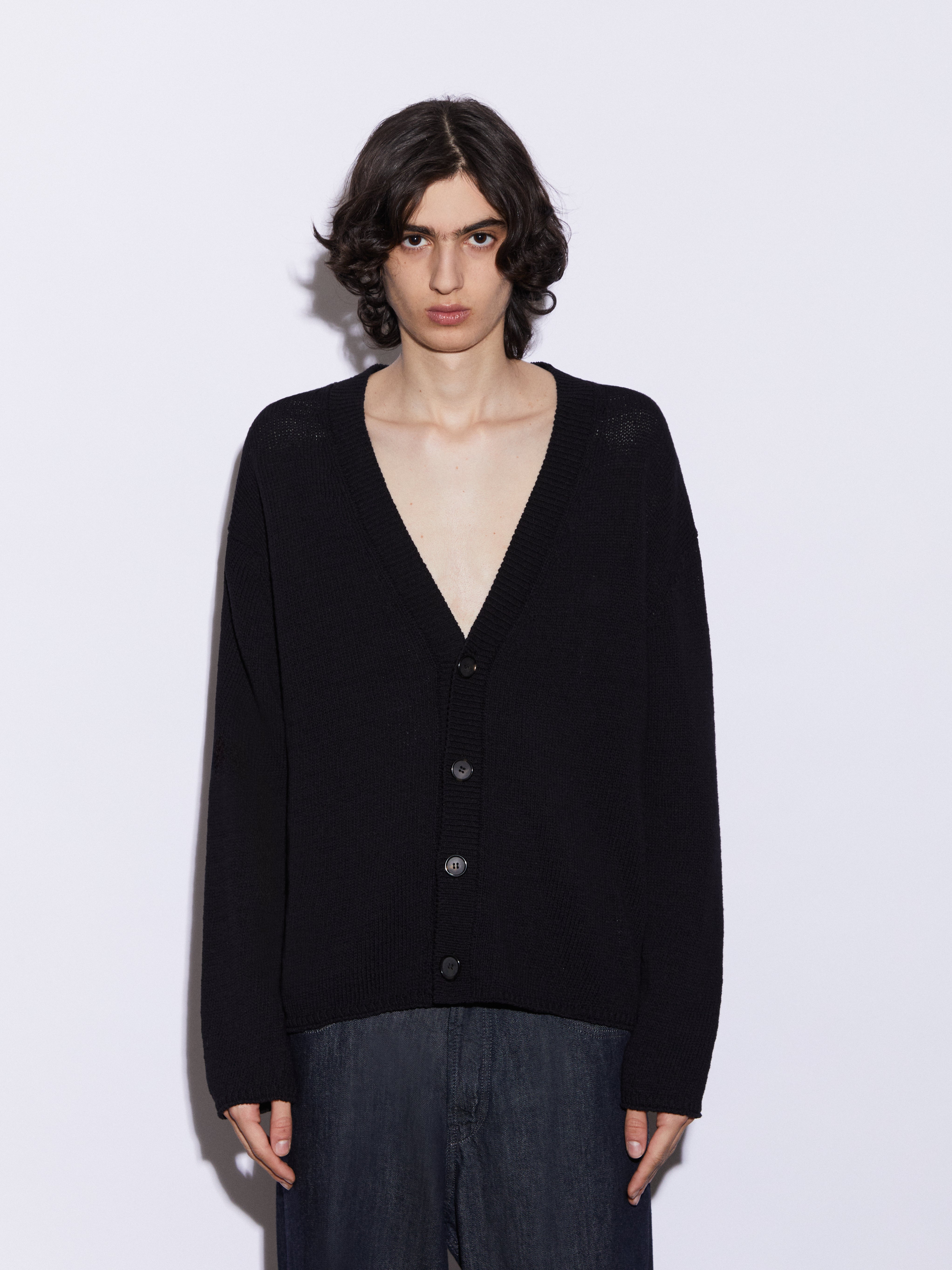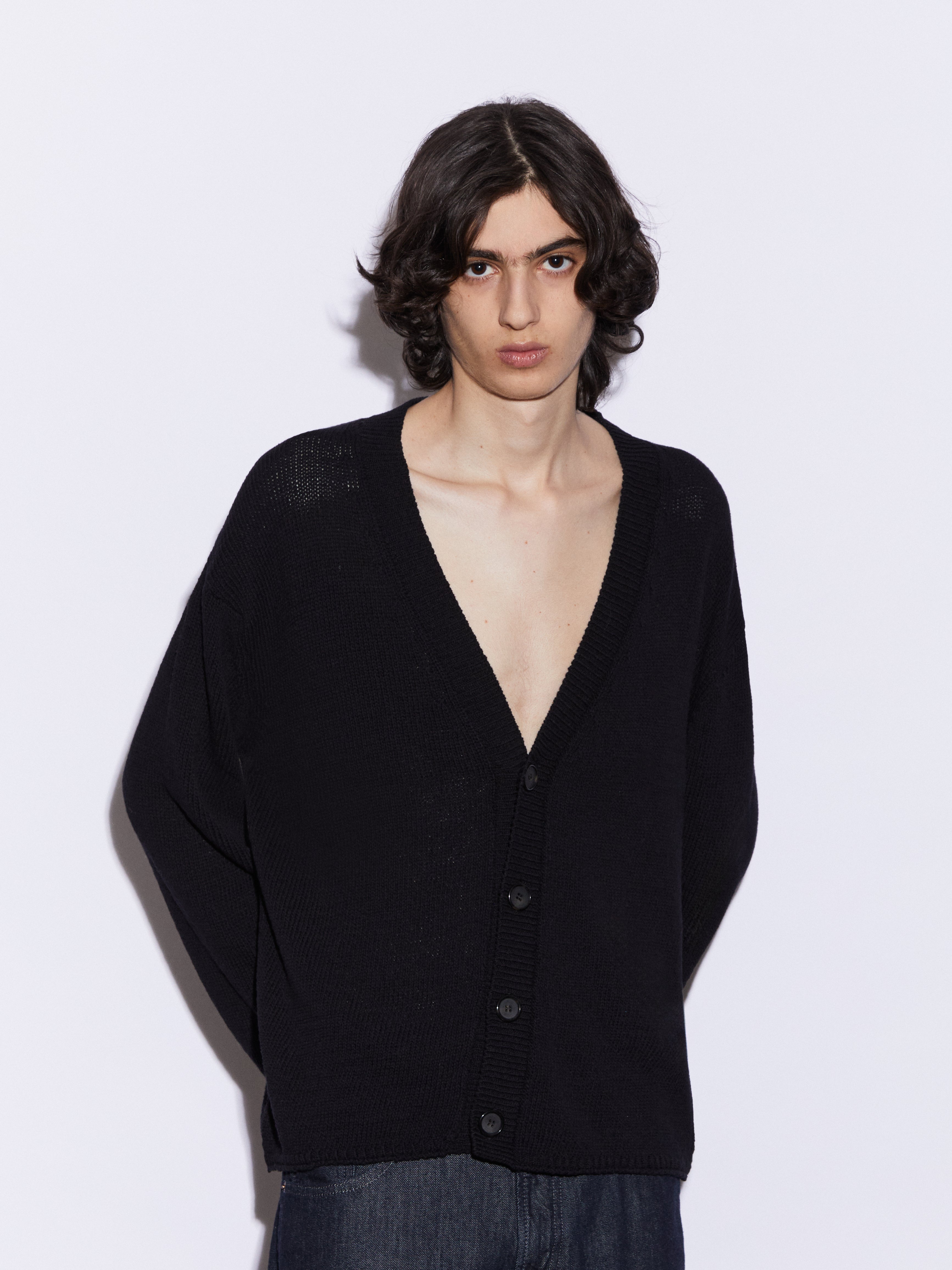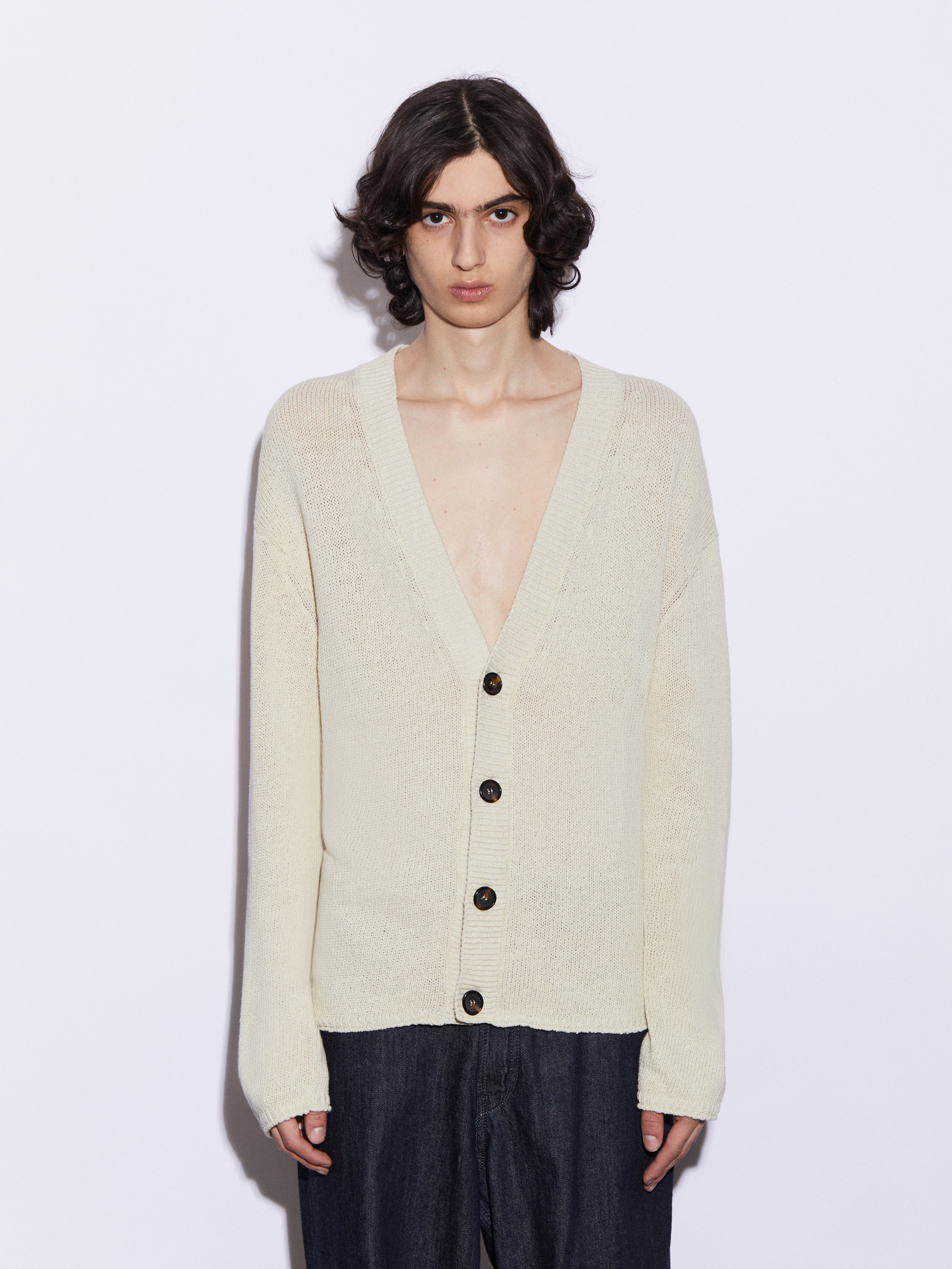 Cardigan made of plain-knit cotton, where the construction highlights the material and the presence of the yarn. The surface is full and defined, with a balanced and comfortable feel. The design is simple, with a front button closure that blends naturally into the garment's line. The oversized and contemporary fit is designed for understated elegance and versatile versatility.