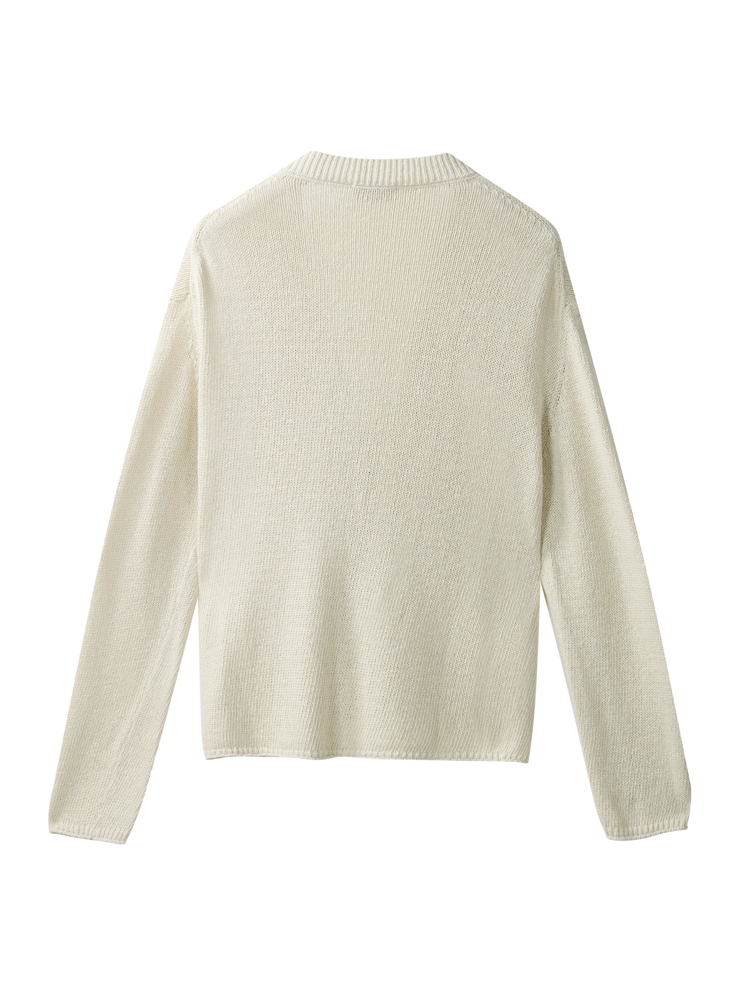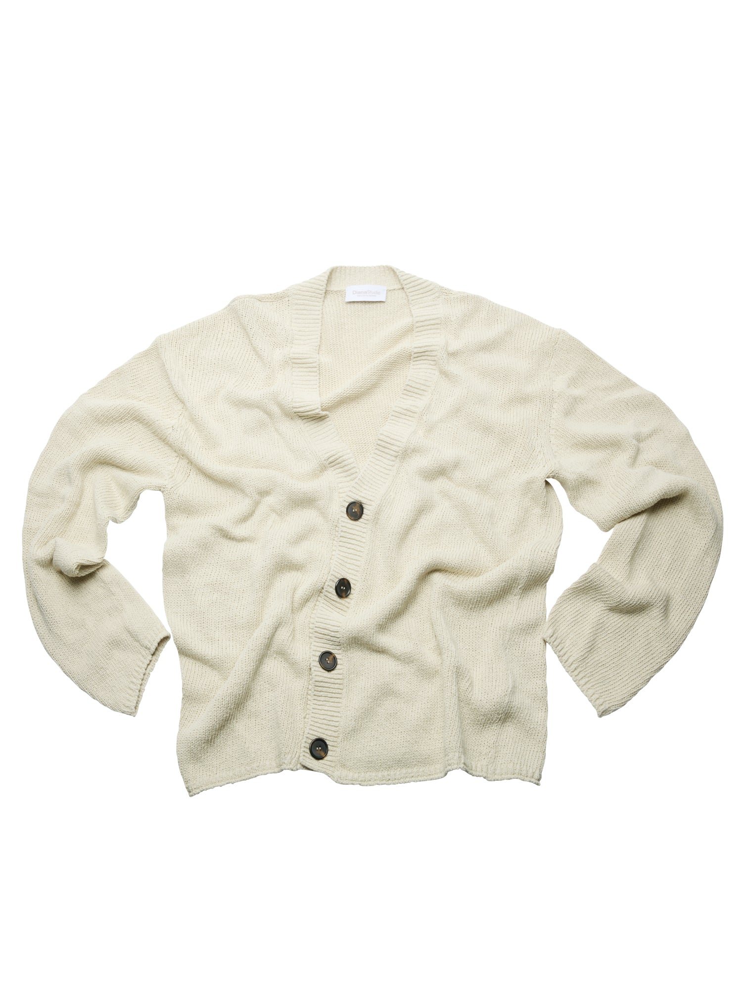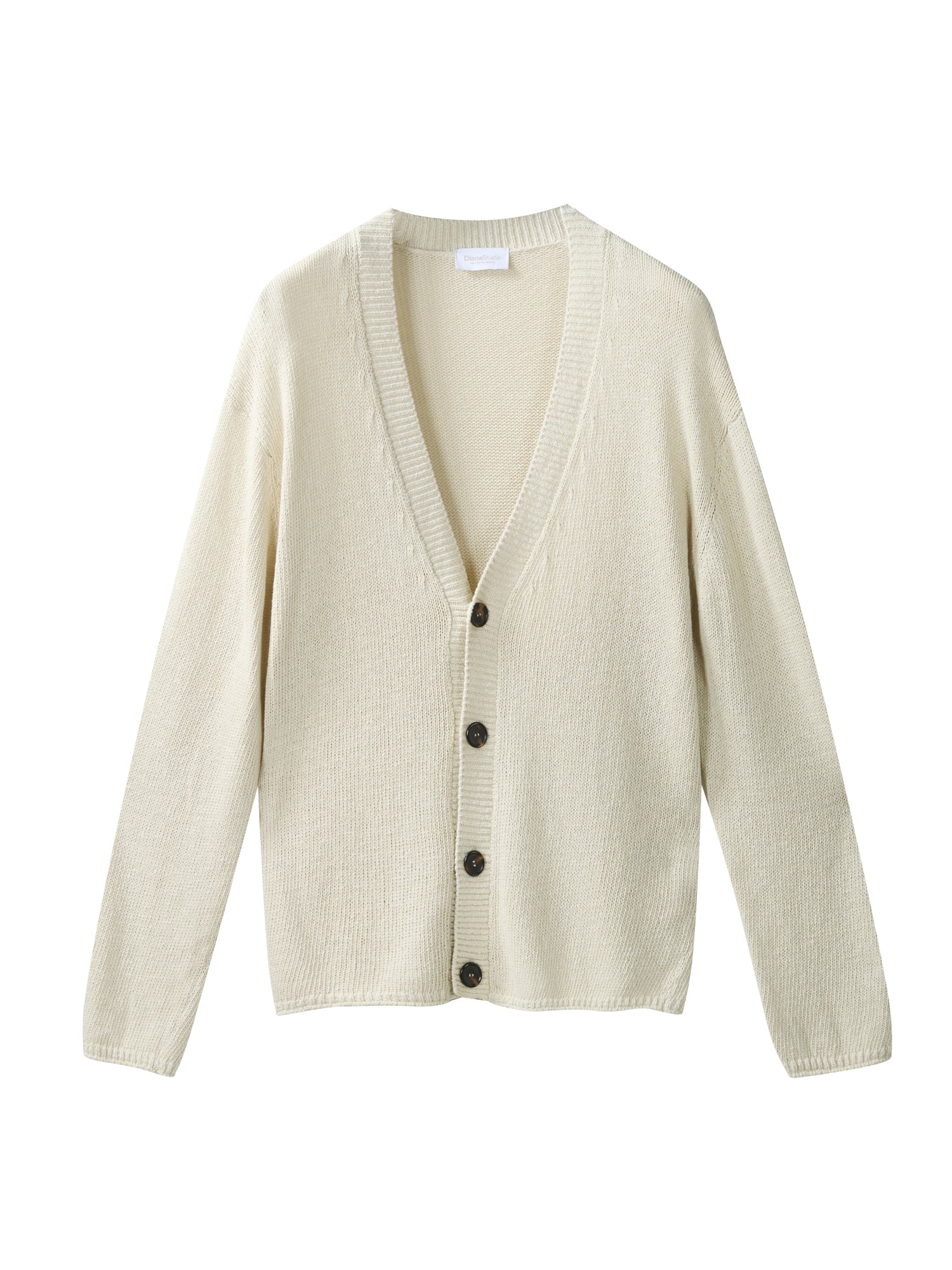 Cardigan made of plain-knit cotton, where the construction highlights the material and the presence of the yarn. The surface is full and defined, with a balanced and comfortable feel. The design is simple, with a front button closure that blends naturally into the garment's line. The oversized and contemporary fit is designed for understated elegance and versatile versatility.