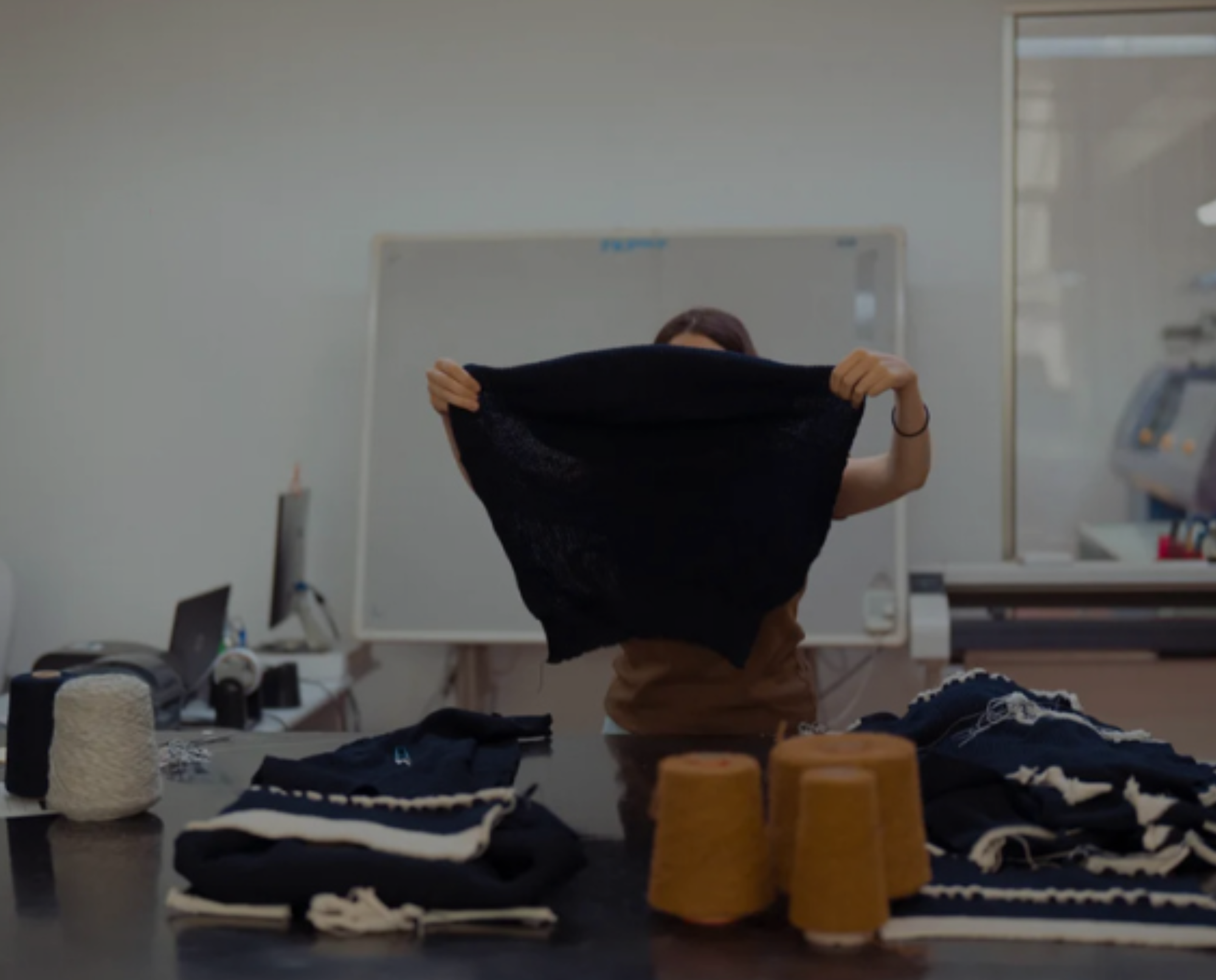 Qui la produzione è verticale: ogni fase viene seguita internamente, dallo sviluppo del modello alla scelta del filato, dalla tessitura alla confezione, fino al lavaggio e al controllo qualità finale.
