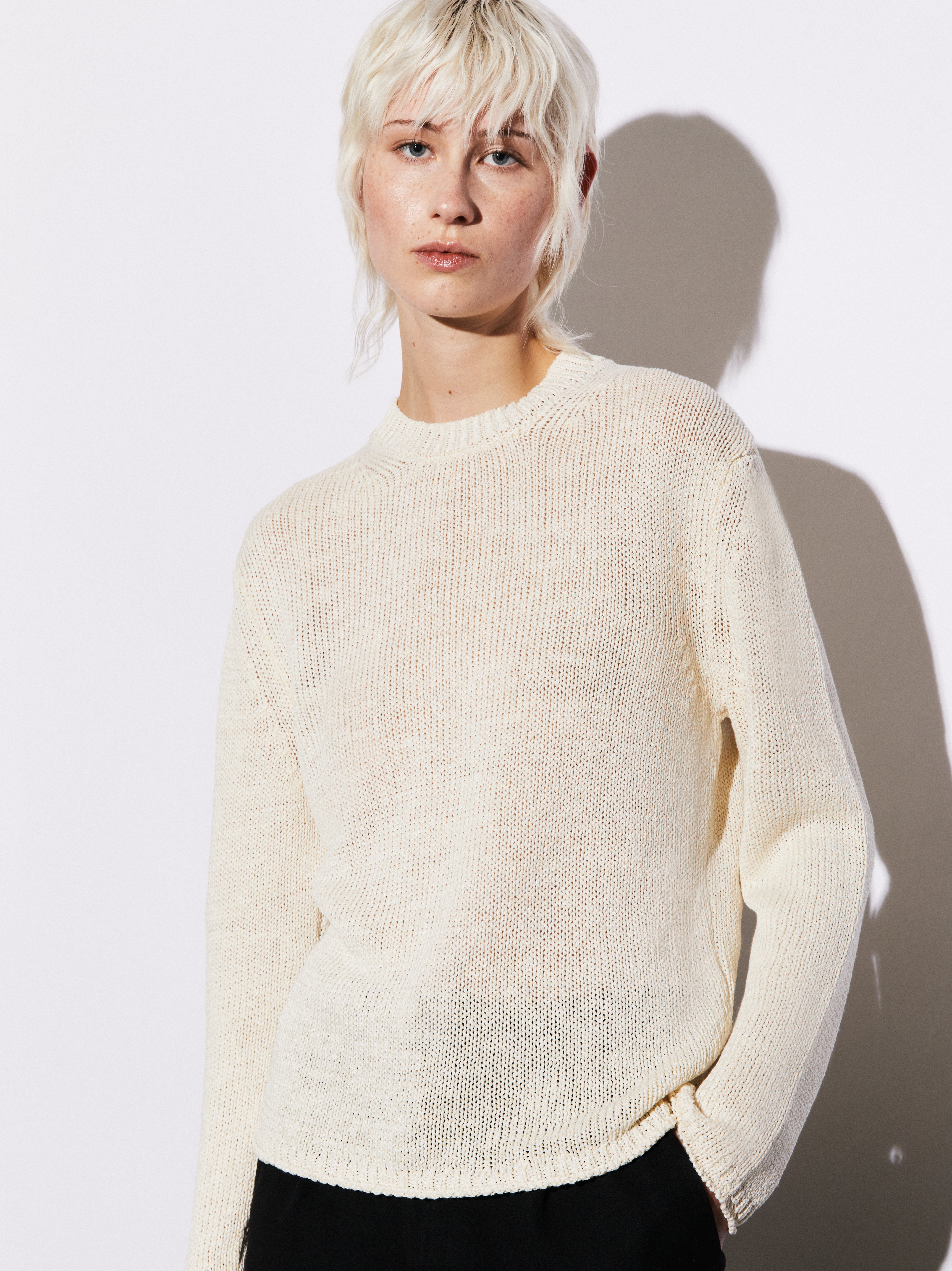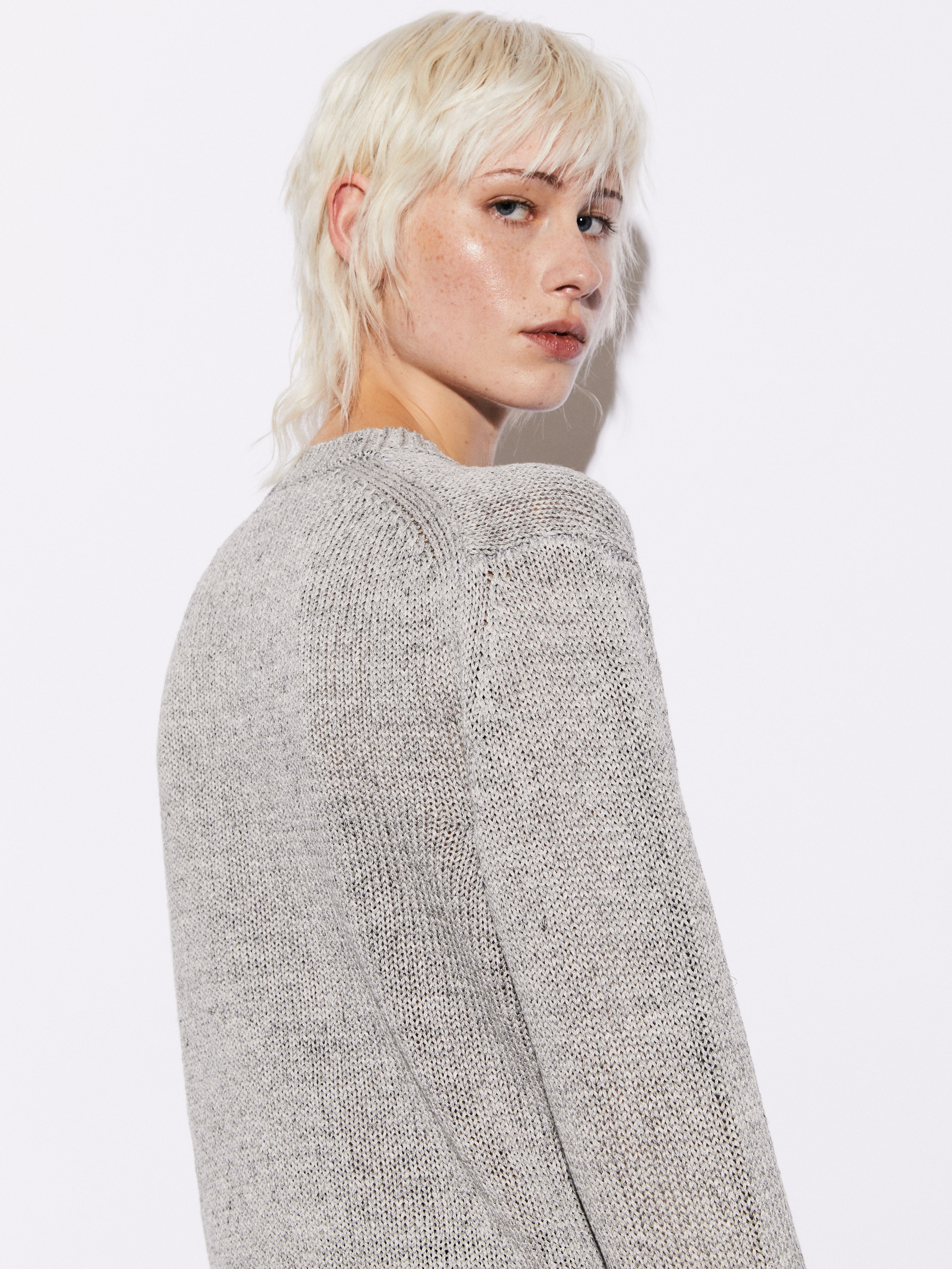 Girocollo realizzato in maglia rasata di lino e seta. La lavorazione su finezza 5 mette il filato in primo piano, esaltando una superficie pulita e ben definita. Il lino apporta freschezza e traspirabilità, mentre la seta aggiunge morbidezza e una luminosità naturale, per una mano piacevole e asciutta. Un capo essenziale e raffinato, pensato per la stagione estiva e per un utilizzo quotidiano elegante e misurato.