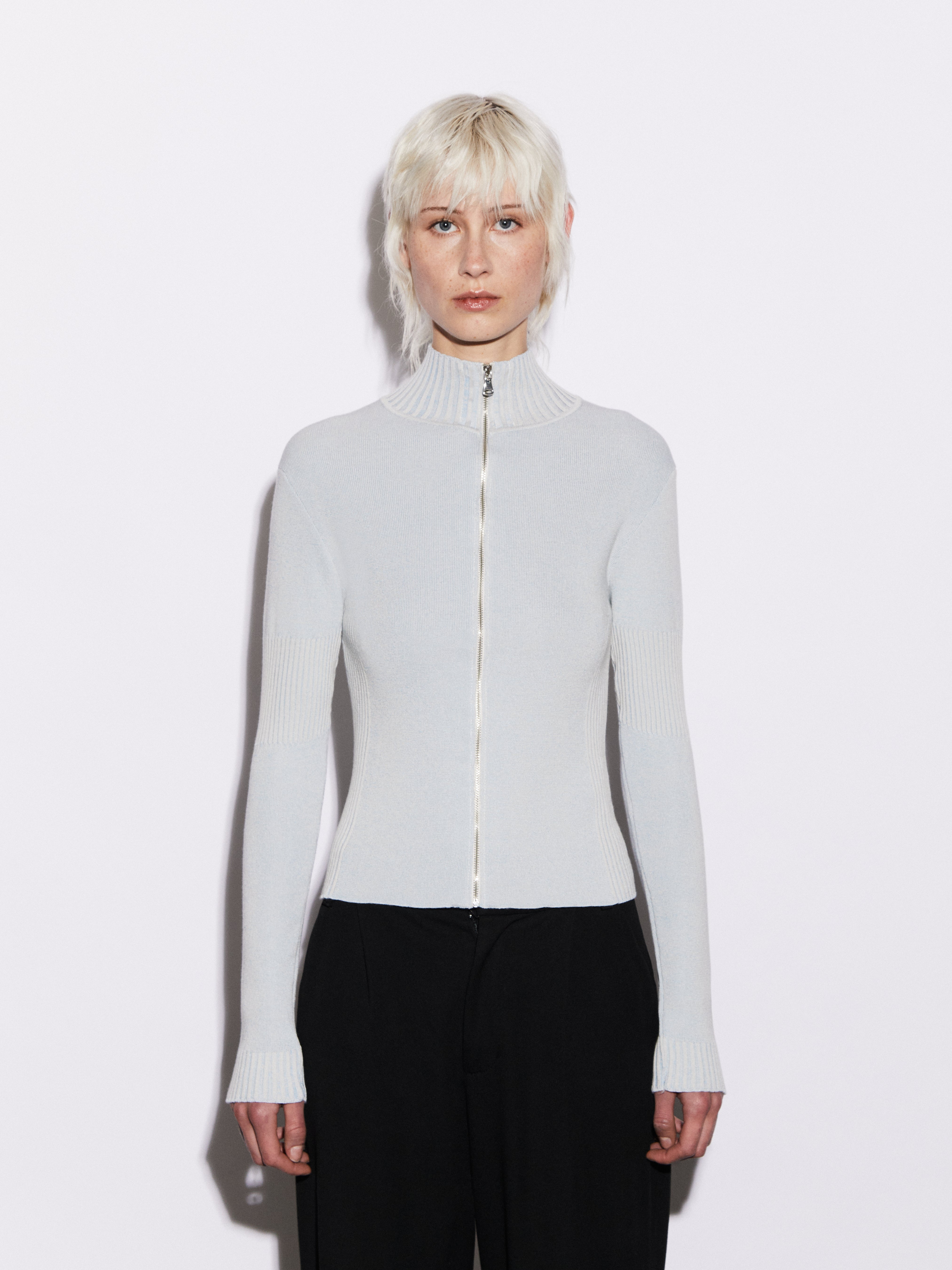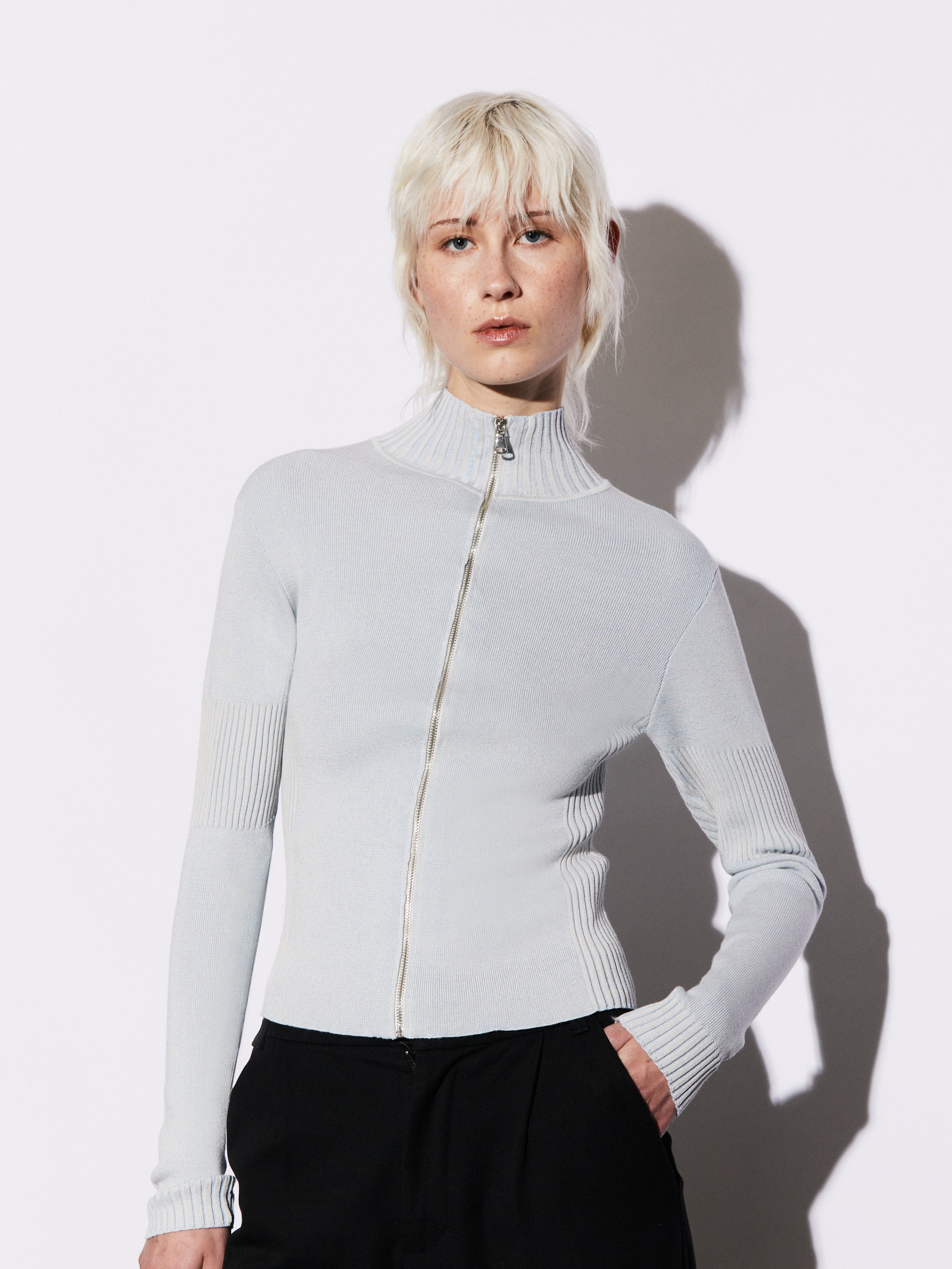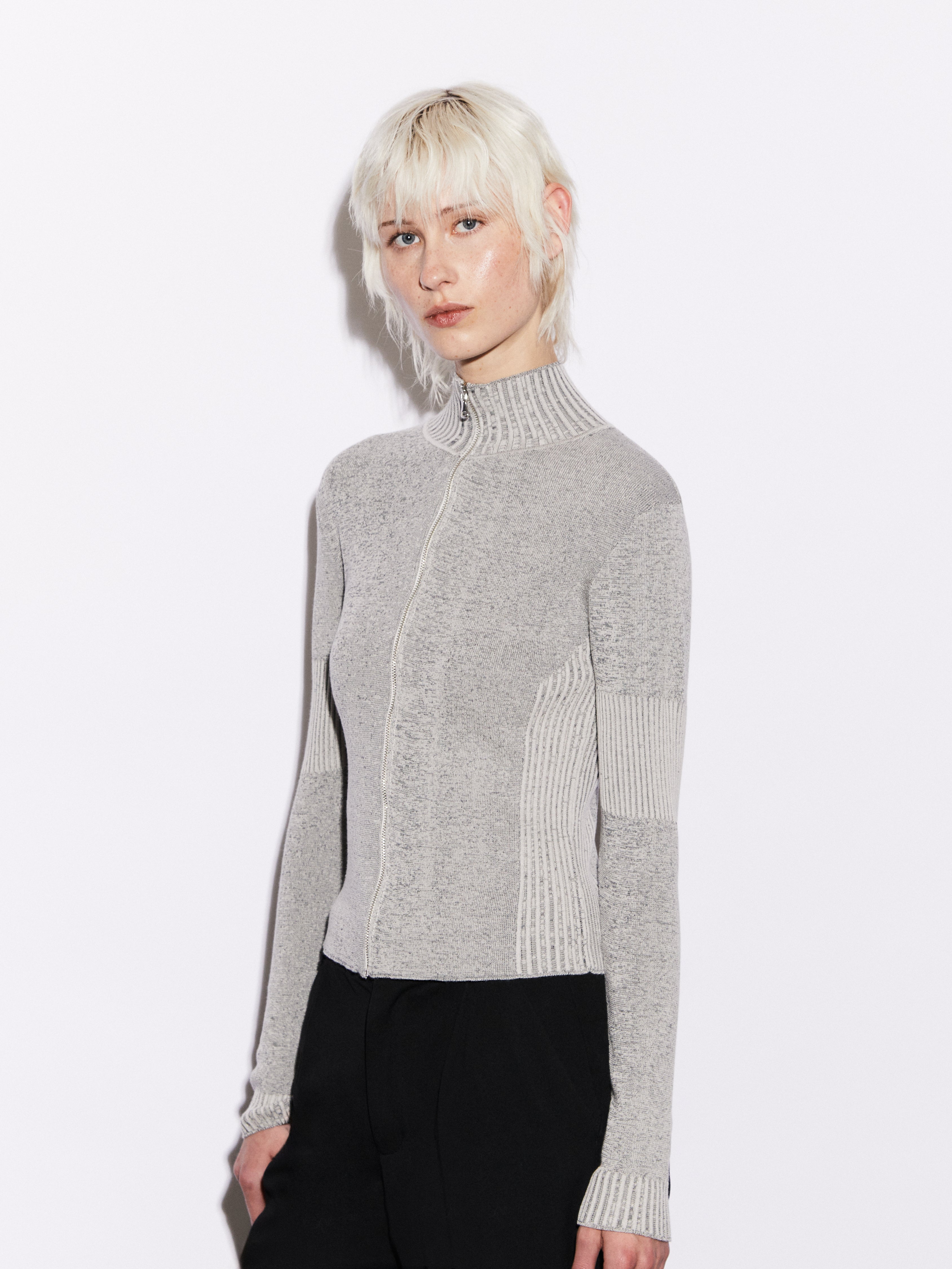 Maglia full zip realizzata in maglia unita full needle di lana e cotone. La costruzione compatta e continua definisce una superficie pulita e uniforme, mentre le lavorazioni a coste sui fianchi, lungo le braccia e sui polsi accompagnano il corpo con precisione, seguendone le forme e valorizzando la silhouette femminile. Il gioco tra maglia unita e coste crea un equilibrio calibrato tra struttura e flessibilità, garantendo comfort e controllo del volume. La linea aderente è pensata per esaltare il corpo in modo naturale, mantenendo un’estetica contemporanea, essenziale e di grande raffinatezza.