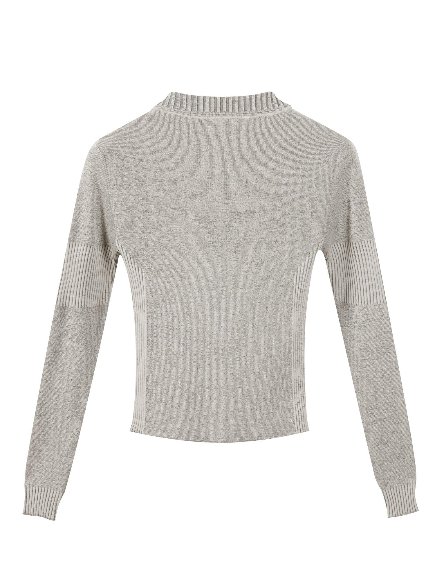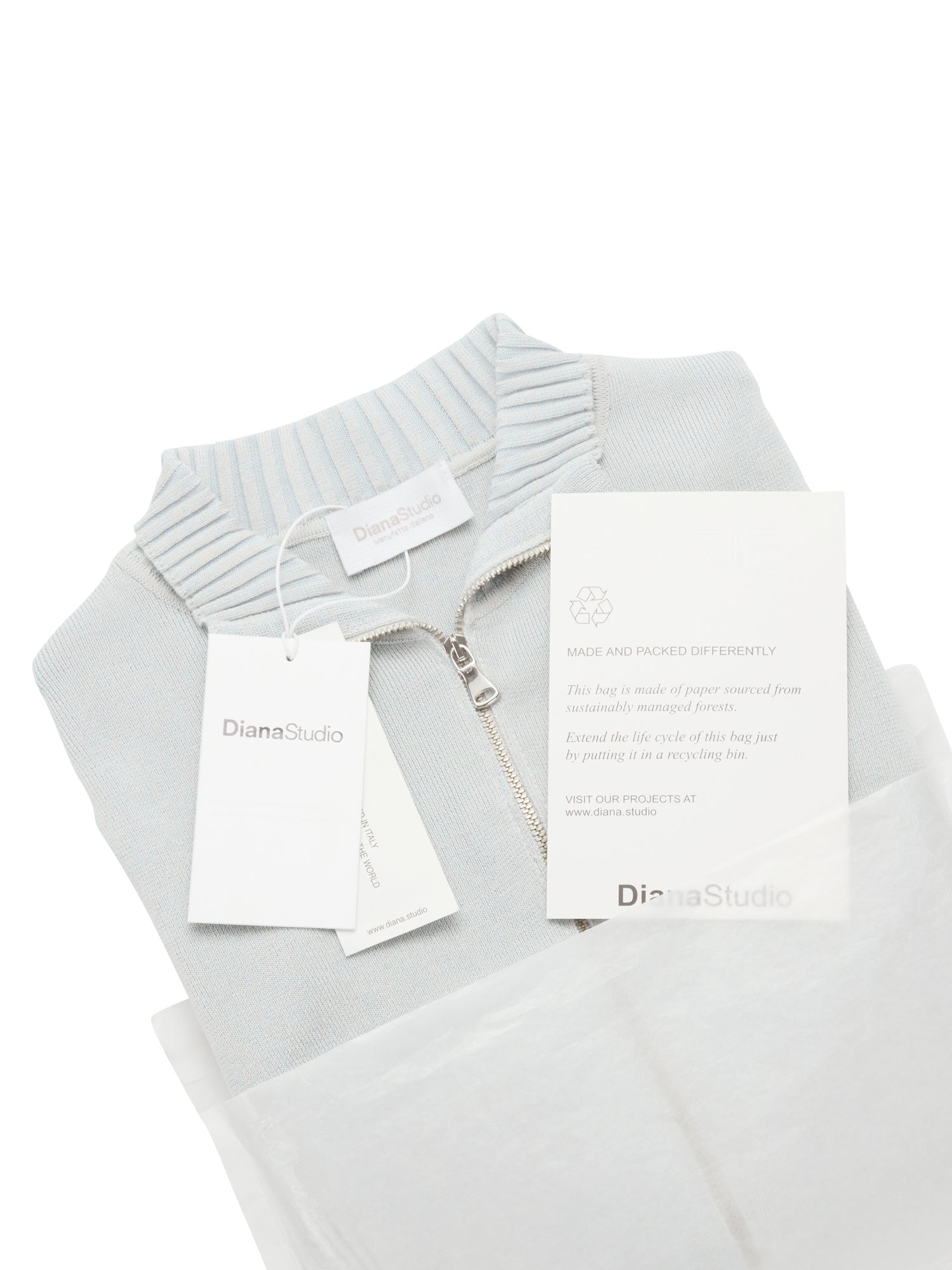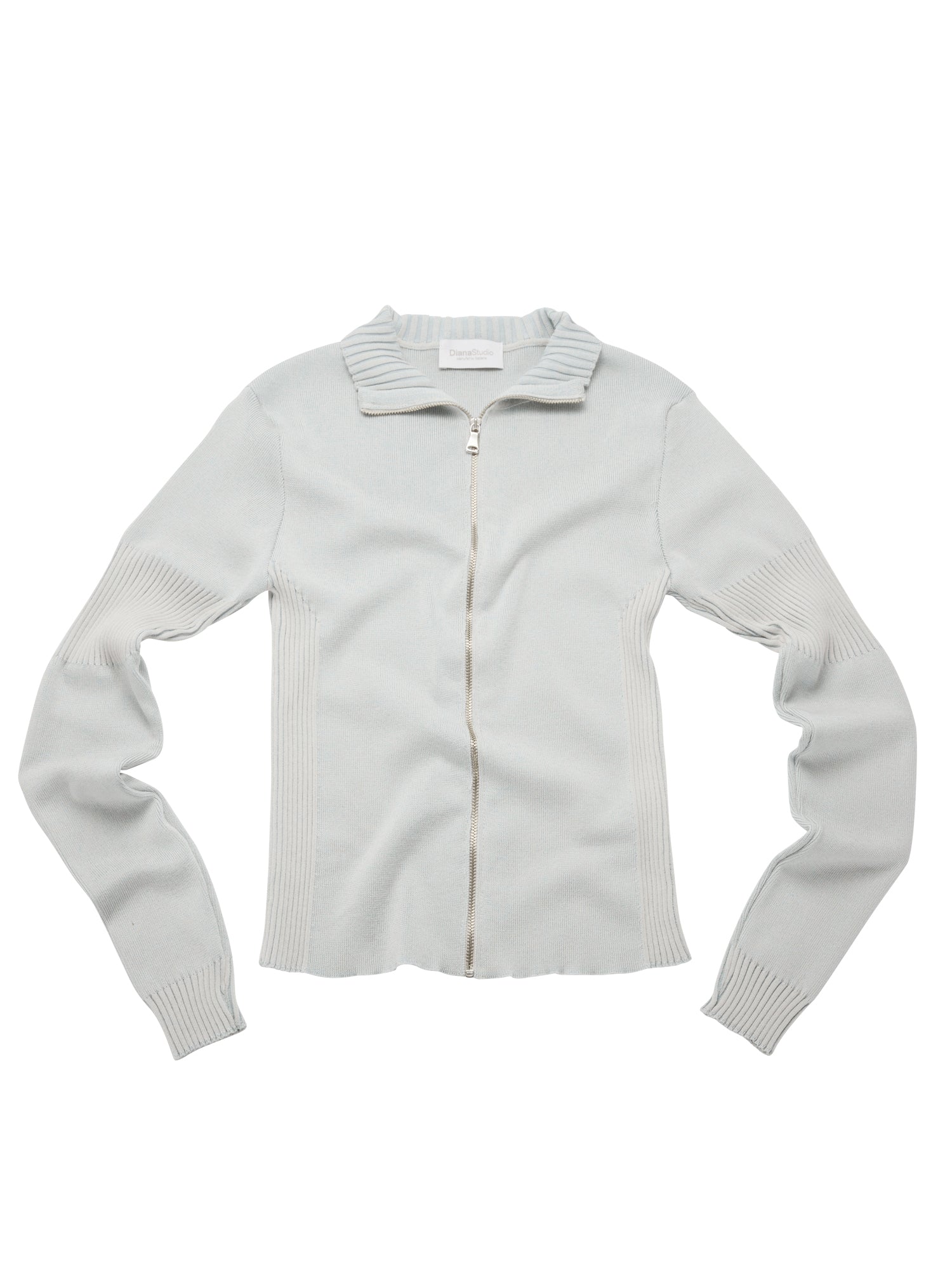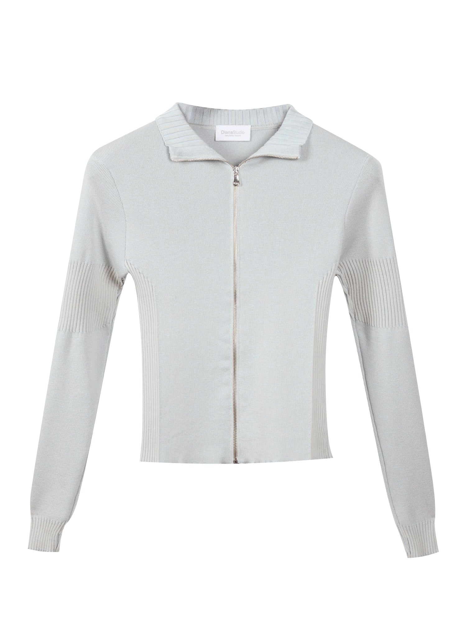 Maglia full zip realizzata in maglia unita full needle di lana e cotone. La costruzione compatta e continua definisce una superficie pulita e uniforme, mentre le lavorazioni a coste sui fianchi, lungo le braccia e sui polsi accompagnano il corpo con precisione, seguendone le forme e valorizzando la silhouette femminile. Il gioco tra maglia unita e coste crea un equilibrio calibrato tra struttura e flessibilità, garantendo comfort e controllo del volume. La linea aderente è pensata per esaltare il corpo in modo naturale, mantenendo un’estetica contemporanea, essenziale e di grande raffinatezza.
