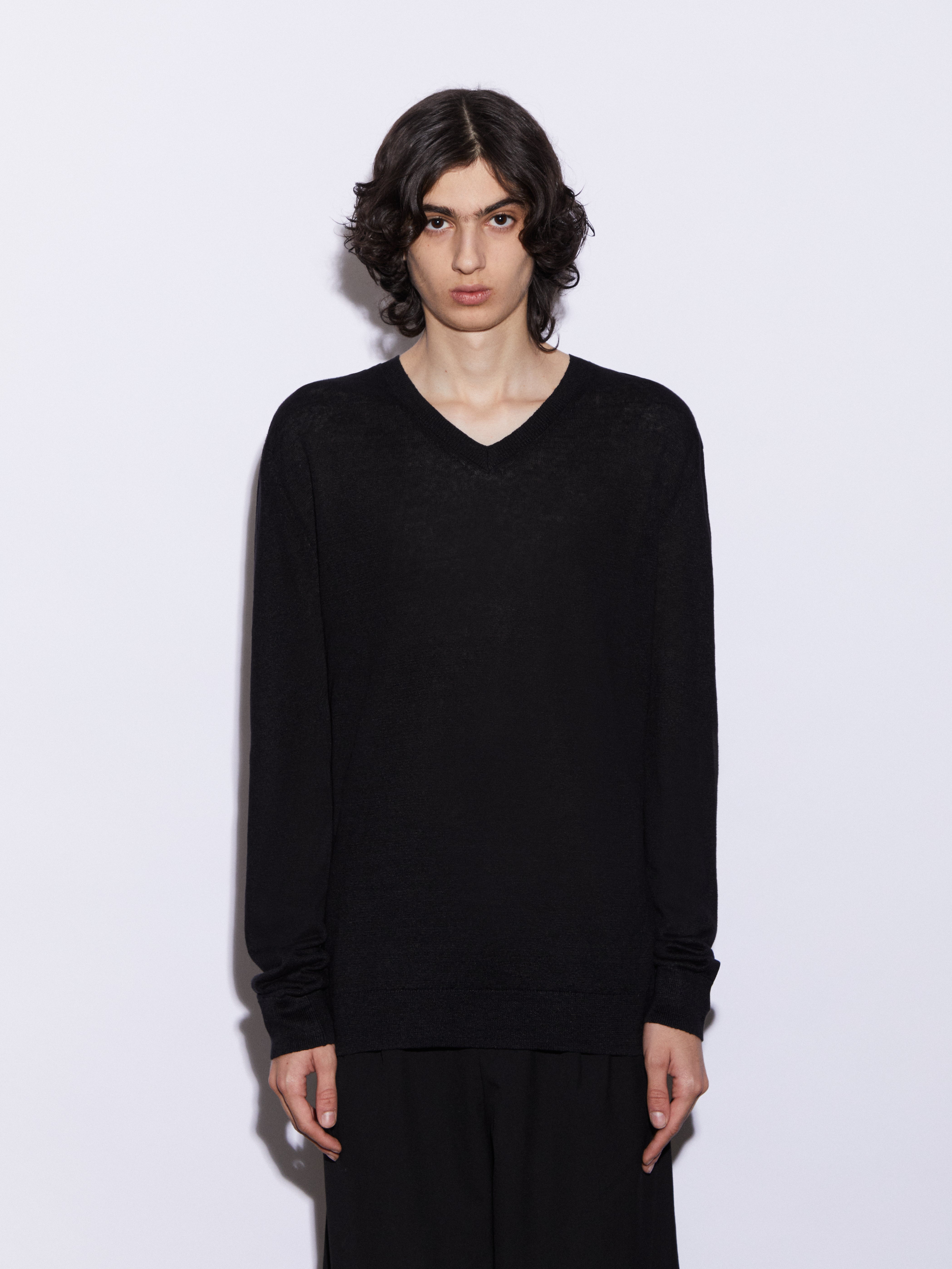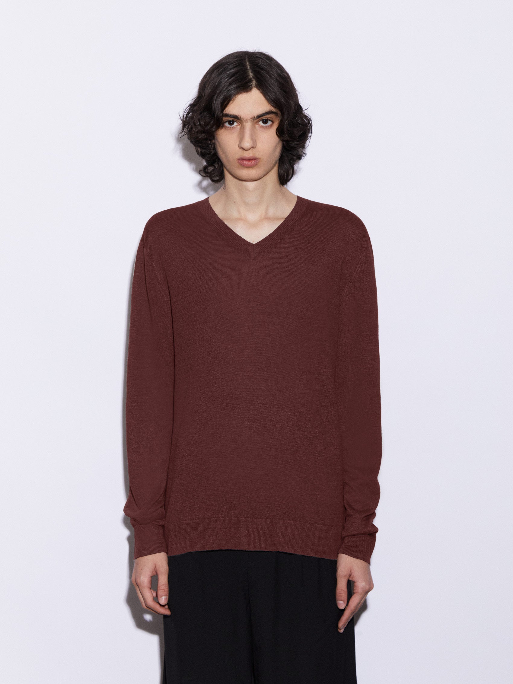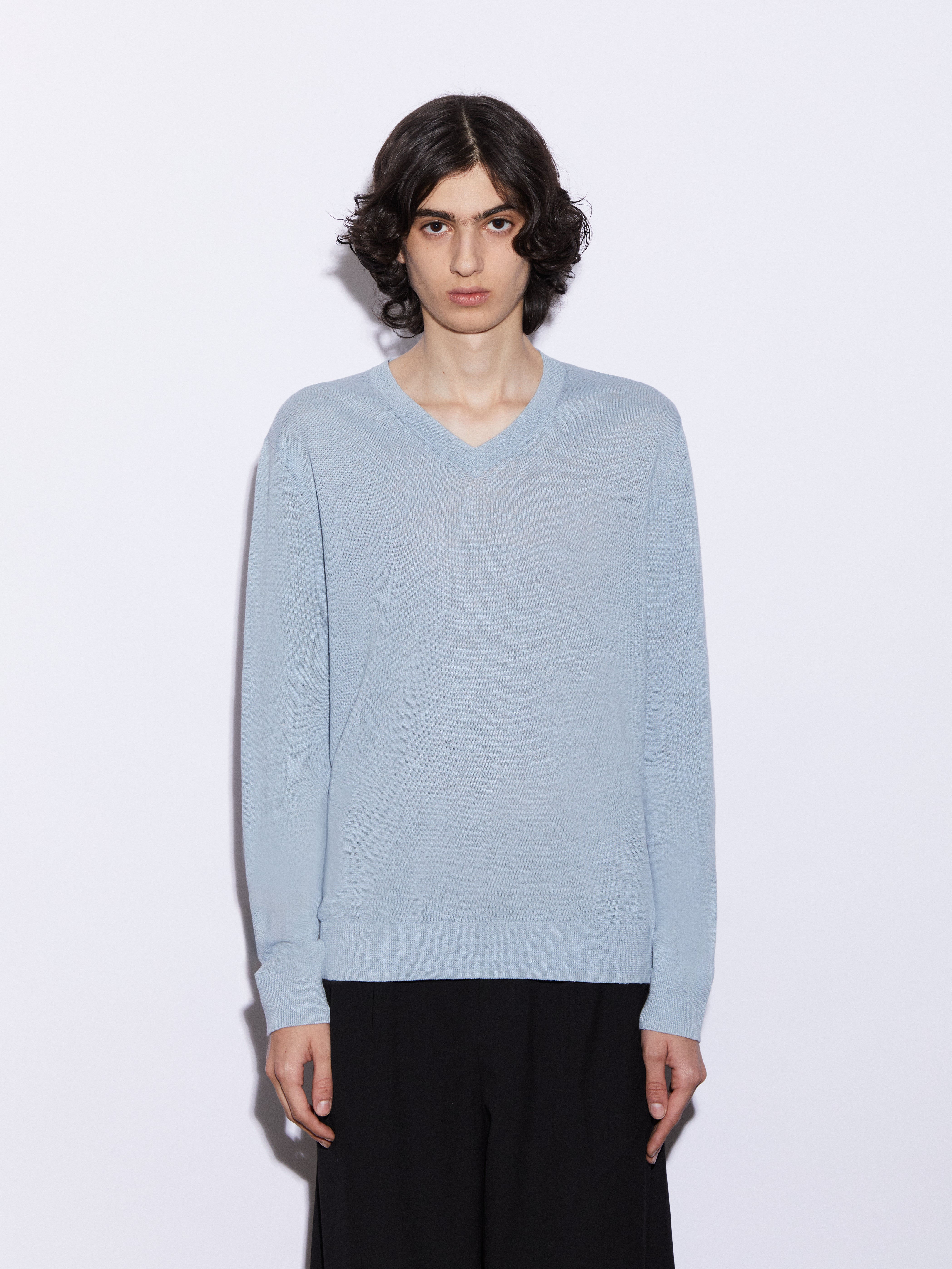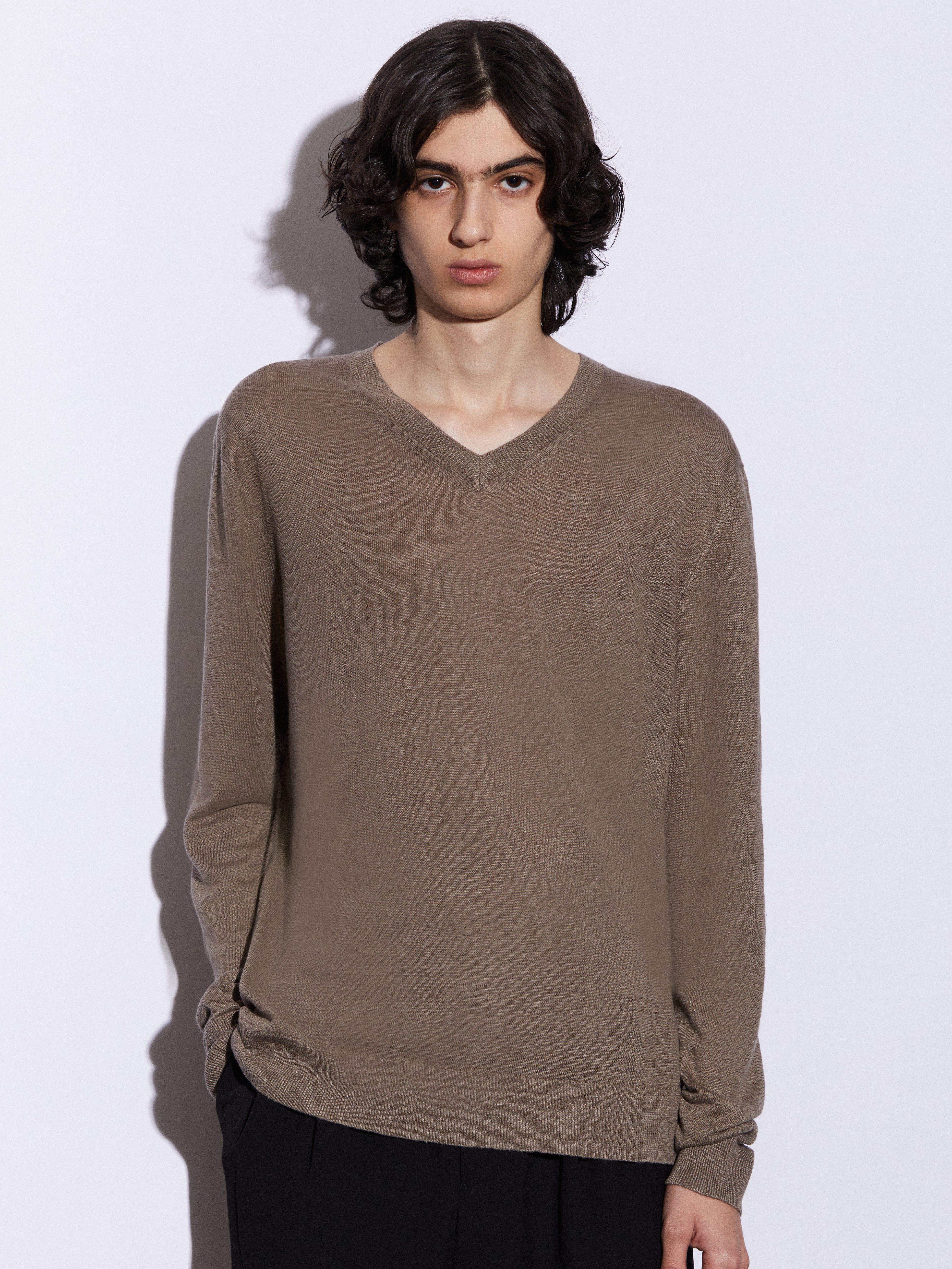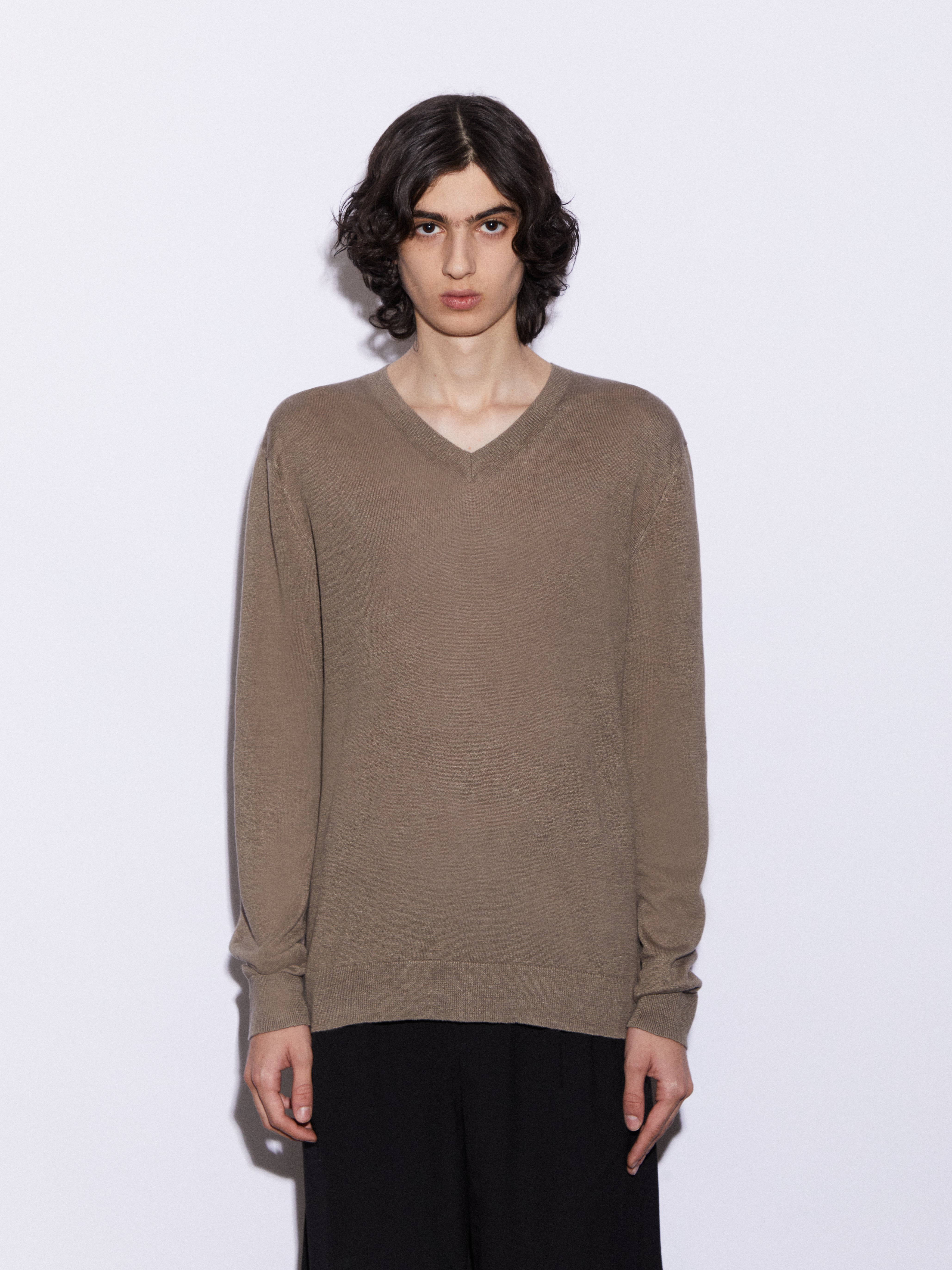 Maglia con scollo a V in 100% lino, realizzata in maglia rasata finezza 12. Leggera e traspirante, con una mano asciutta e una naturale trasparenza, è pensata per accompagnare la stagione estiva con comfort e semplicità. La vestibilità regolare e il taglio pulito definiscono un capo essenziale e versatile, dall’estetica contemporanea e disinvolta.